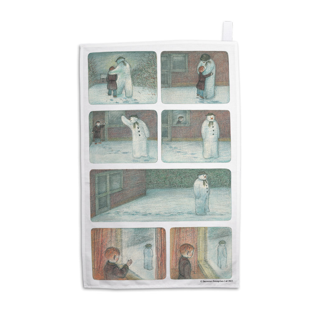 Step into a winter wonderland with The Original Snowman Movie Scenes Tea Towel. This tea towel is made of 100% cotton and is hemmed on all four sides. It also has a useful hanging loop sewn in. The size is approximately 45x70cm, making it the perfect size for your kitchen or bathroom. You can wash this tea towel at low 30 degrees temperatures only. Iron on reverse. This tea towel is proudly printed and produced in the UK.